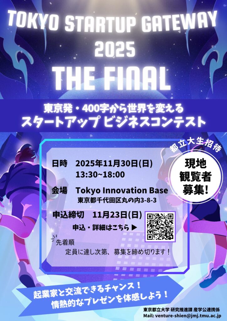 東京都が主催するビジネスコンテスト、「TOKYO STARTUP GATEWAY 2025」(TSG)の決勝大会(THE FINAL)について、都立大生限定で現地観覧にご招待します!