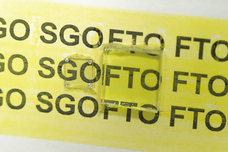 電極の作製方法も重要なポイントです。私たちは、酸化スズやタンタルを混合したペレットをレーザーで蒸発させ、基板上に堆積させる気相成長法とよばれるプロセスを使っています。電極の組成や厚みを原子レベルで精密に制御できるため、高品質な膜が合成できます。
