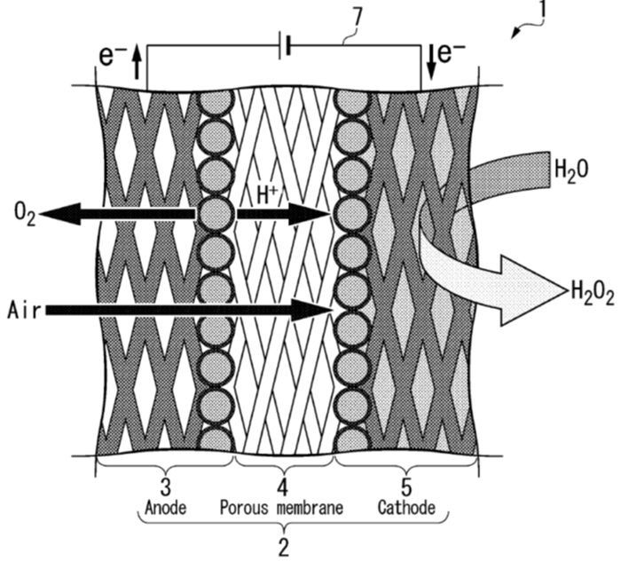 過酸化水素(H2O2)やギ酸(HCO2H)などの化学品やエネルギーキャリアを、従来よりも高効率かつ容易に製造する技術が望まれています。本発明では、下図に示すように、アノード電極3、多孔質な電解質膜4、カソード電極5が積層してなる膜電極接合体2を利用します。例えば、アノードとカソードとの間で細孔を介して酸素(O2)をクロスオーバーさせることにより、高効率な電力利用(90%以上の電流効率)でH2O2を製造することができます。
